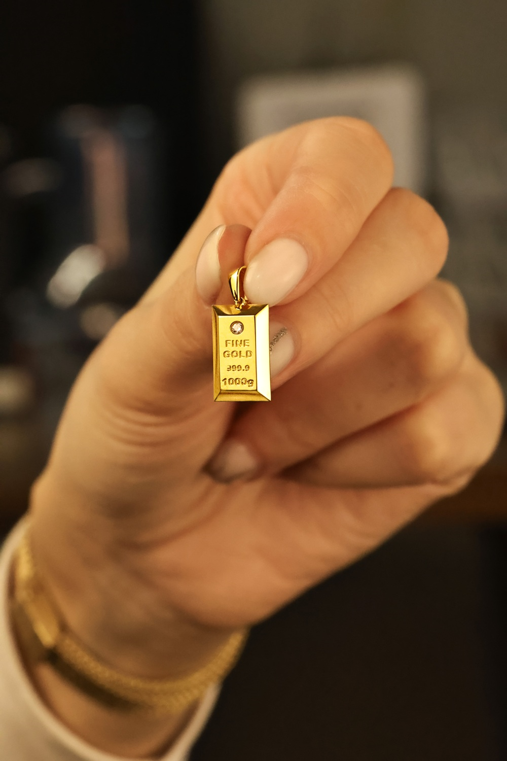 Kolye koleksiyonumuza ait 8 ayar altından üretilen, külçe brolog ağırlığı yaklaşık olarak 0,80 gram gelmektedir.
