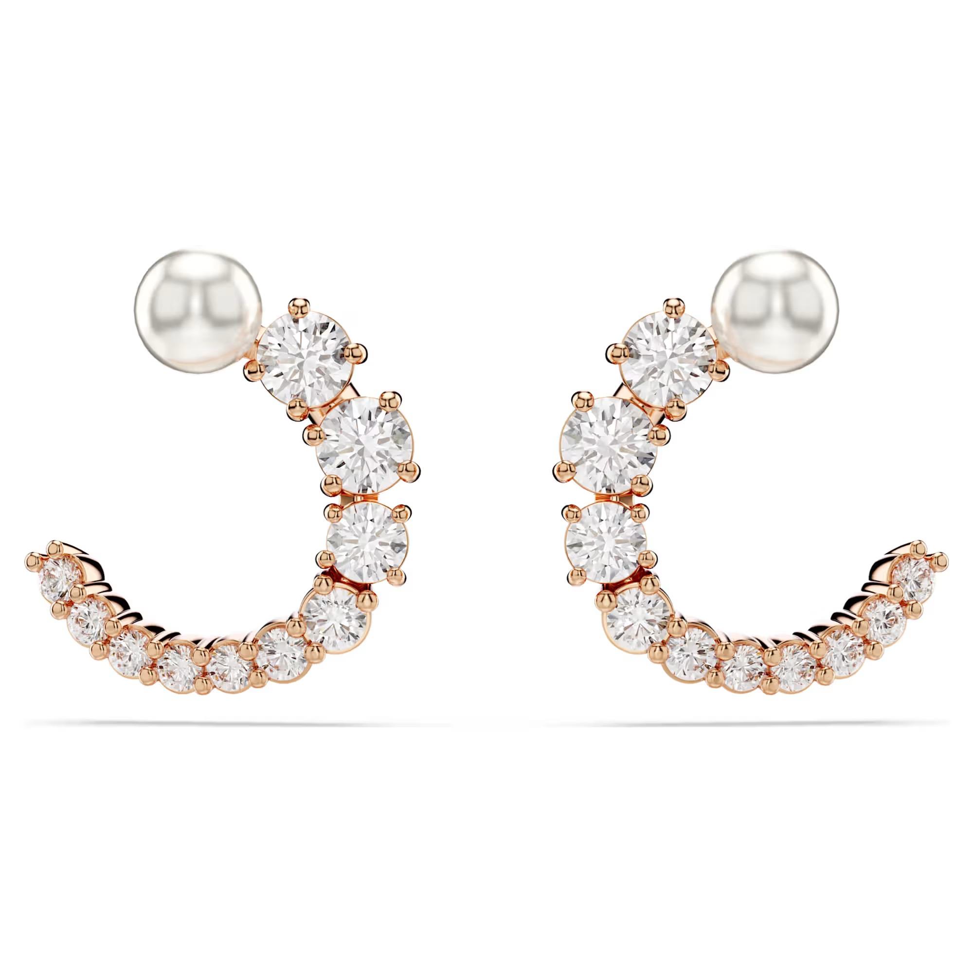 Bu iğneli küpelerin her bir detayı güzellik yayıyor. Her bir pembe altın rengi kaplama düğme küpe, boyları büyükten küçüğe doğru değişen berrak bir Swarovski Zirkonya açık yüzükle tamamlanırken üst kısmında ise beyaz bir Swarovski Kristal İnci ile destekleniyor. Spot ışıklarını üzerinize çekmek için uyumlu bir Matrix kolyeyle birlikte kullanın.